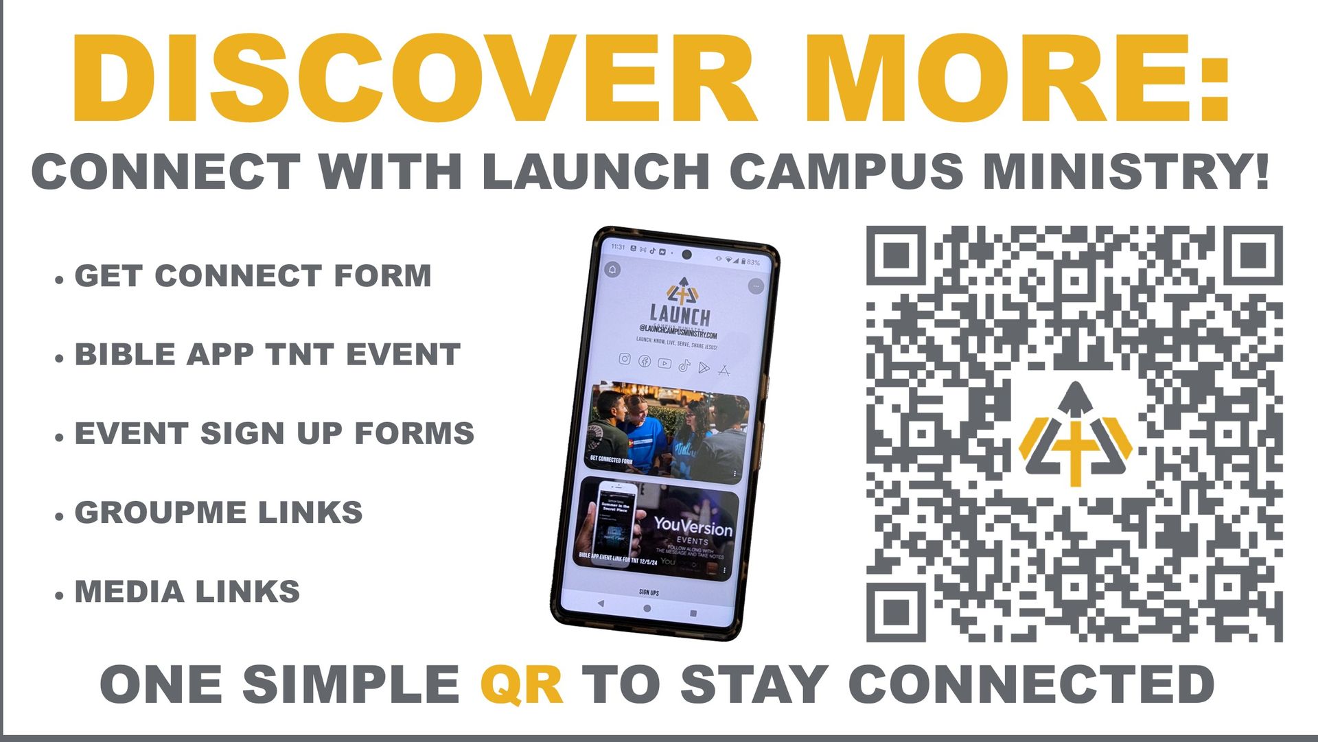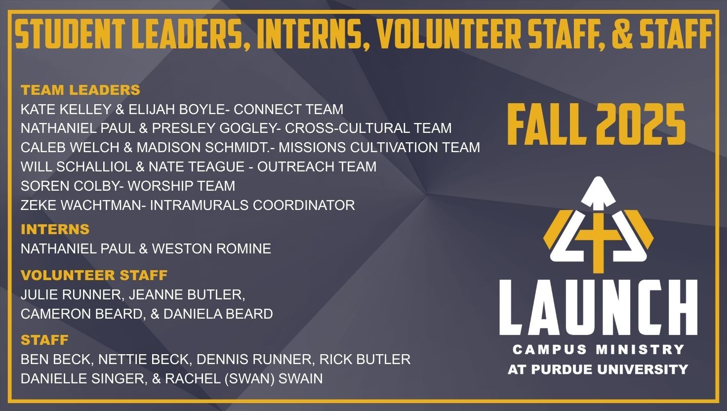 Student Leaders serve as leaders of Teams as well as coordinate the Activities and Events of Launch Campus Ministry. There is an application and interview process to be appointed to this position.